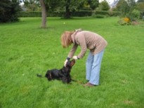 ![]() c) unsere Körpersprache dasselbe ausdrückt wie unsere akustischen und optischen Signale. Im Bild rechten Bild z. B. lobt die Besitzerin ihren Hund zwar mit Worten, bedroht ihn aber aus seiner Sicht gleichzeitig, indem sie sich über ihn beugt und die Hand auf seinen Kopf legt. |